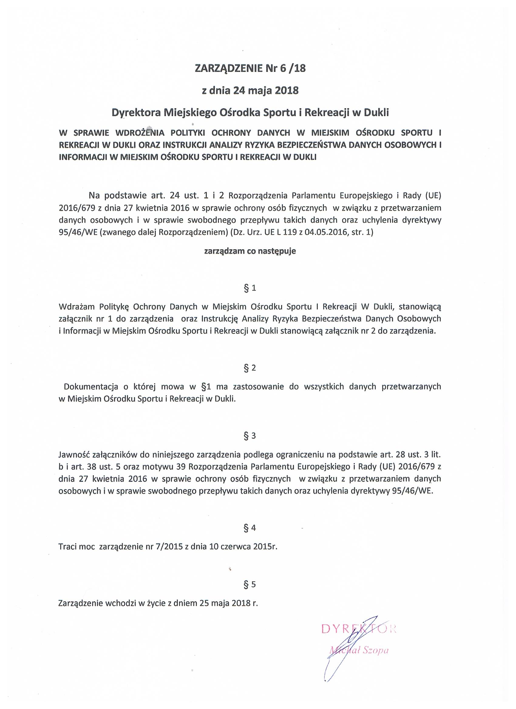 W SPRAWIE WDROŻENIA POLITYKI OCHRONY DANYCH W MIEJSKIM OŚRODKU SPORTU I REKREACJI W DUKLI ORAZ INSTRUKCJI ANALIZY RYZYKA BEZPIECZEŃSTWA DANYCH OSOBOWYCH I INFORMACJI W MIEJSKIM OŚRODKU SPORTU I REKREACJI W DUKLI