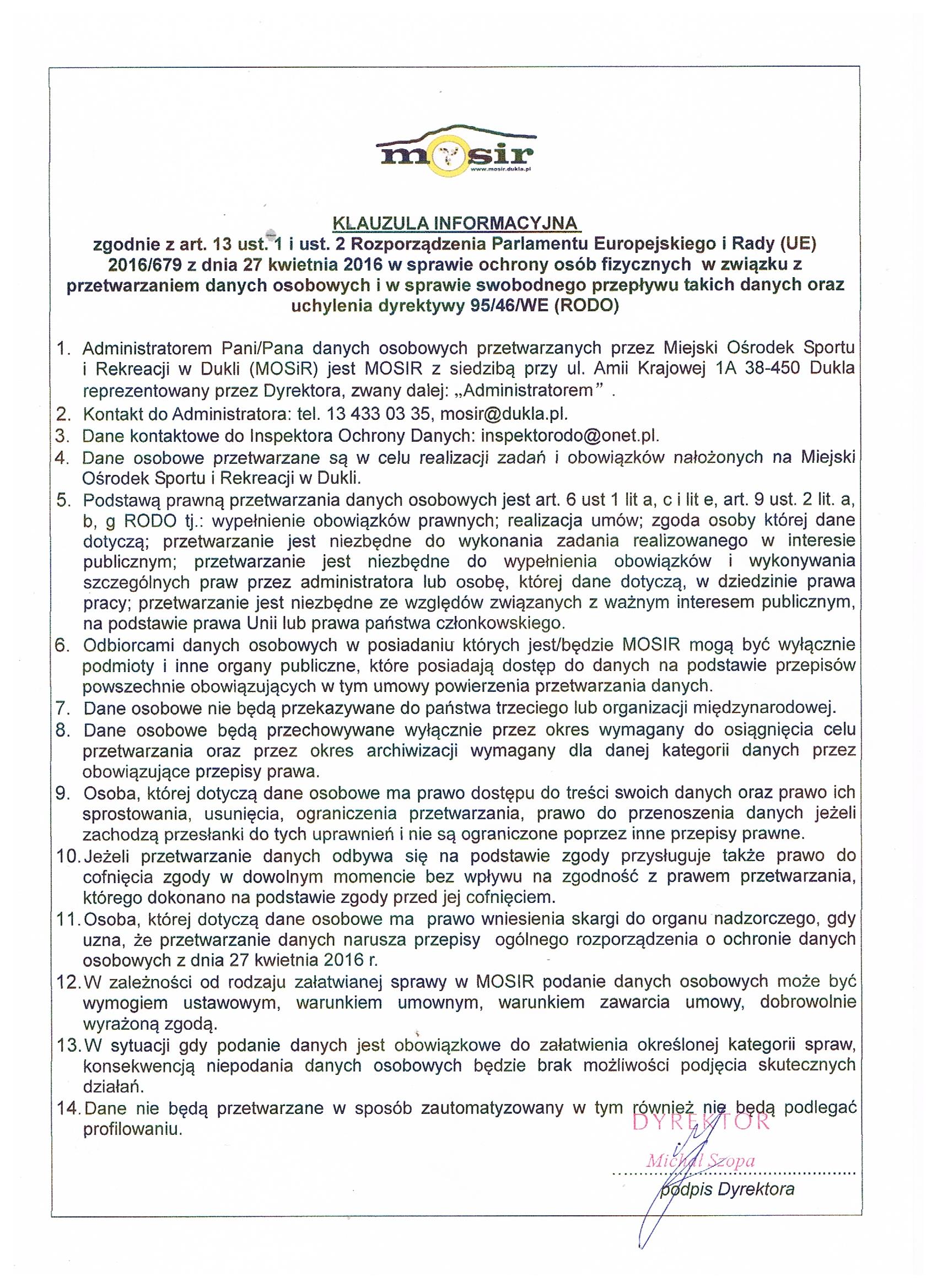 2. Kontakt do Administratora: tel. 13 433 03 35, mosir@dukla.pl.